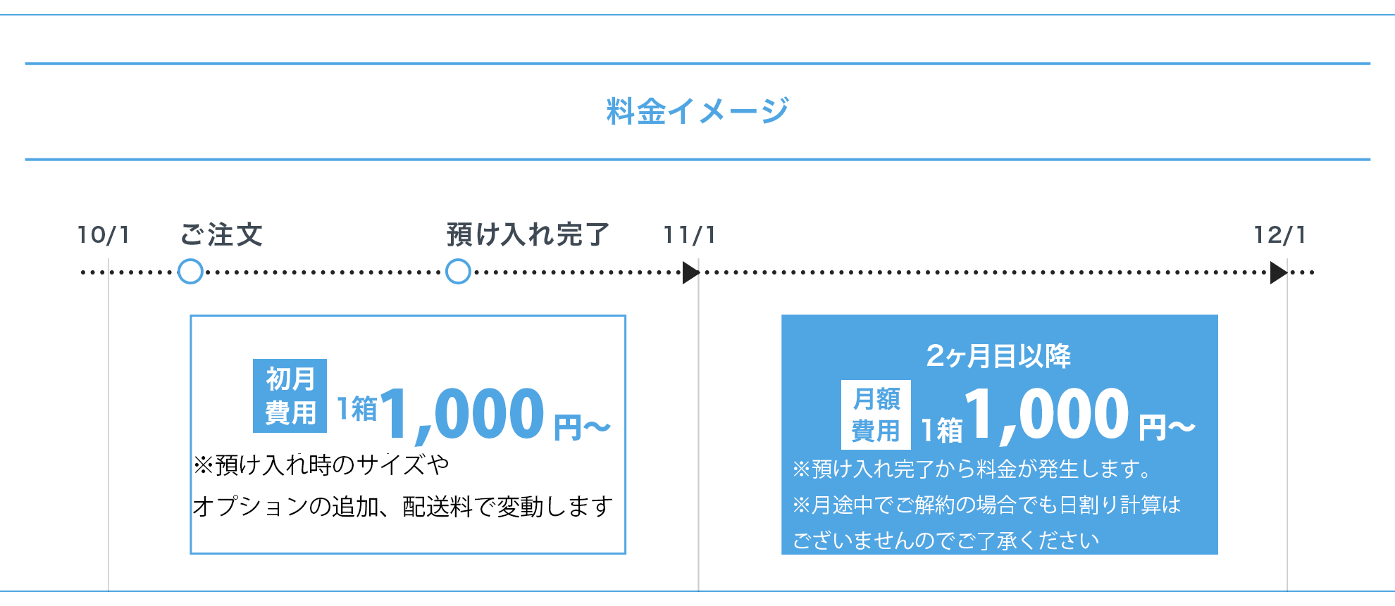 ※3辺の合計が150cm/重量が20kgまでは月額1,000円。それ以降は1cmごとに7円/1kgごと50円の追加料金となります。
